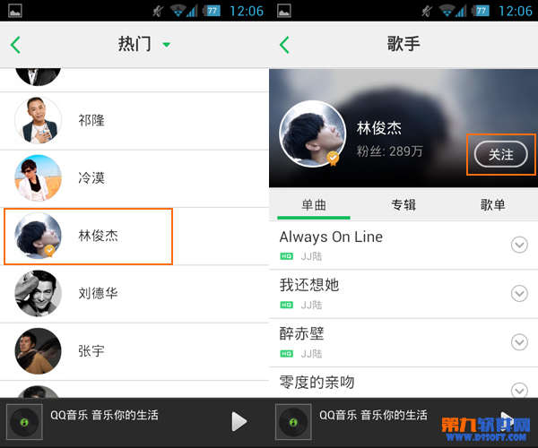 选择了自己喜欢的歌手后,点击进入歌手的详细页面,里面有歌手的单曲和专辑以及歌单。在歌手页中有一个“关注”的按钮,点击就可以对歌手进行关注了。